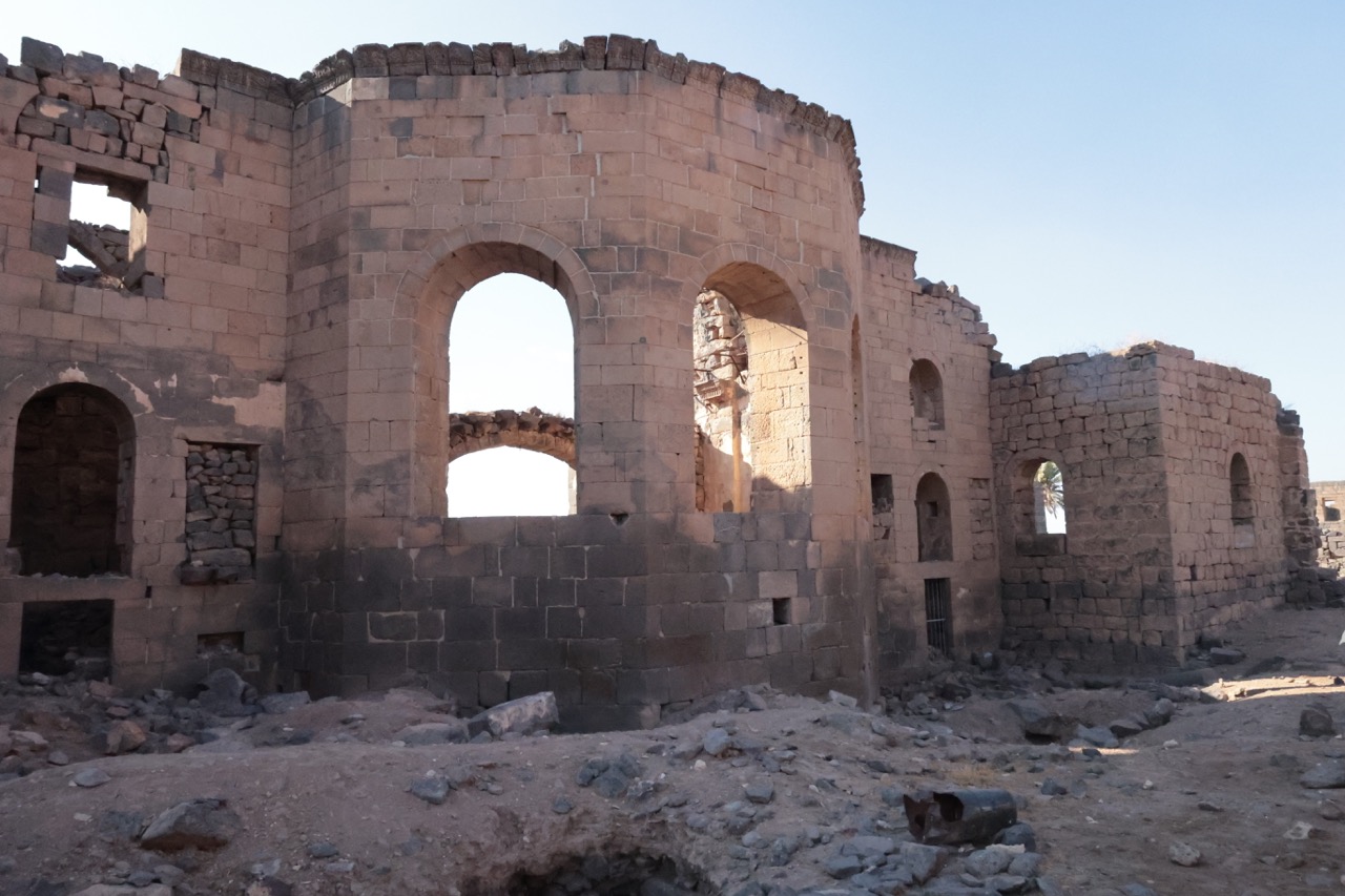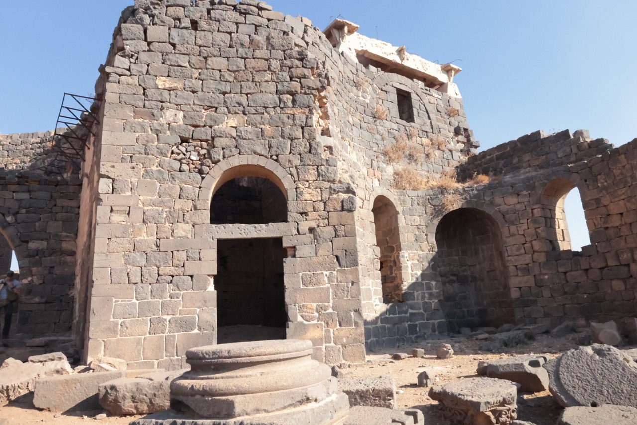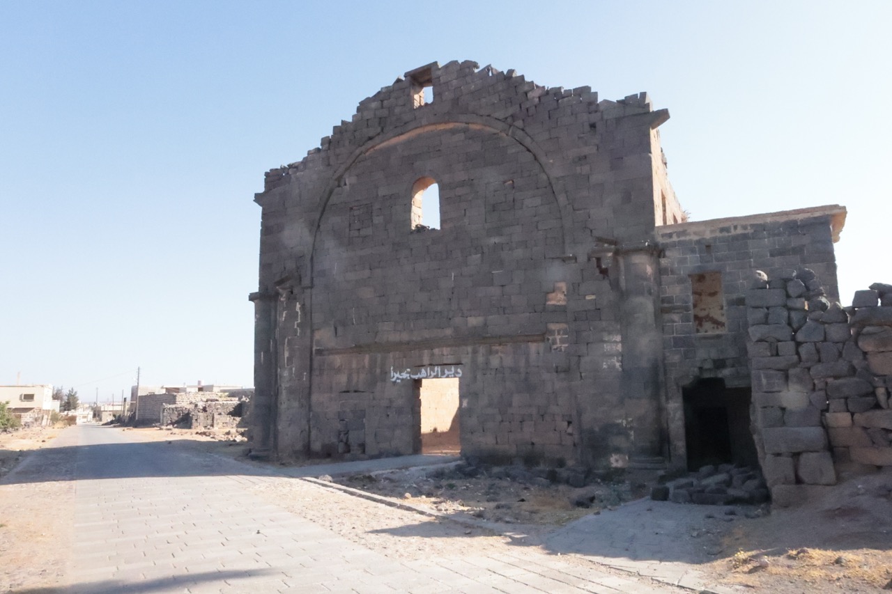 В 513 году, согласно исчезнувшей надписи, был построен храм свв. Сергия, Вакха и Леонтия. Культ первых двух святых пришел в Босру из северосирийской Ресафы, возможно, вместе с планом колонного тетраконха. Однако в Босре он был переосмыслен: четырехлепестковая колоннада с Г-образными столпами была вписана в круг, который, в свою очередь, был помещен внутрь квадрата, из-за чего стены храма оказались прорезаны внутри и снаружи многочисленными апсидами и полукруглыми нишами. Сложную форму имеет и восточная часть храма: по сторонам вимы с выраженной снаружи апсидой расположены проходные помещения (закрывавшиеся дверями), к которым примыкают два пастофория с апсидами. Храм был украшен резными деталями из местного базальта. В ходе войны в южную стену церкви попал снаряд. К востоку от храма находятся два сильно перестроенных богатых византийских дома, один из которых, с триконхиальным залом, отождествлялся с епископским дворцом.