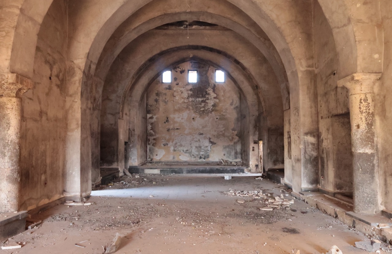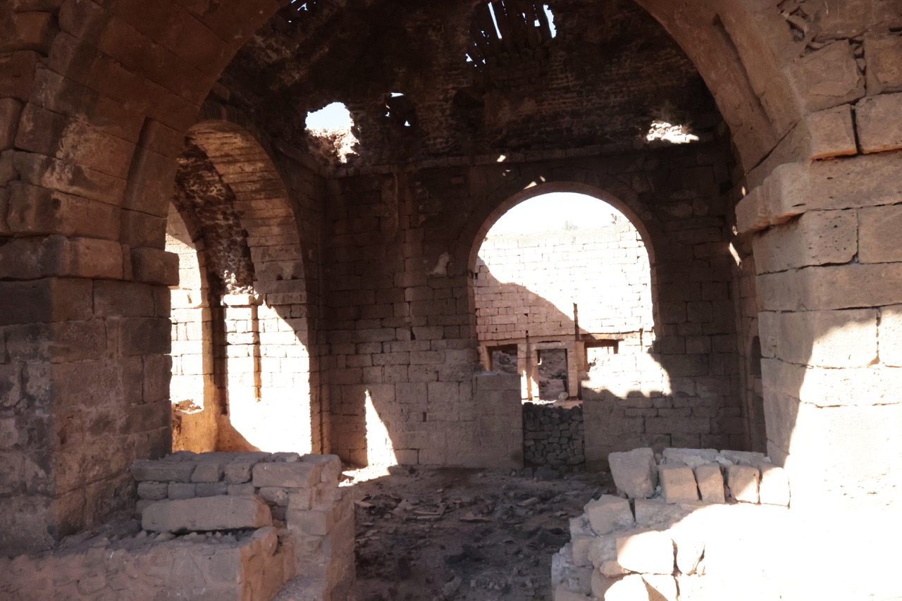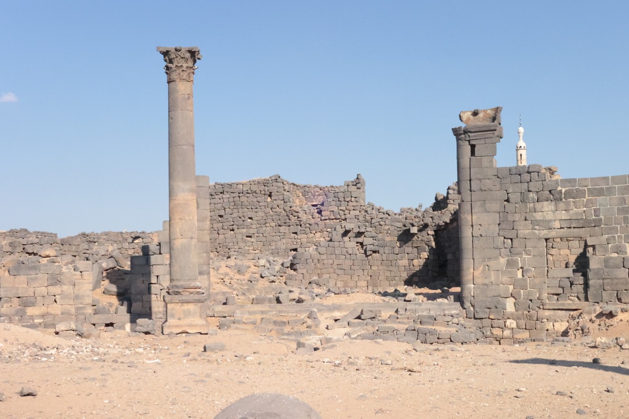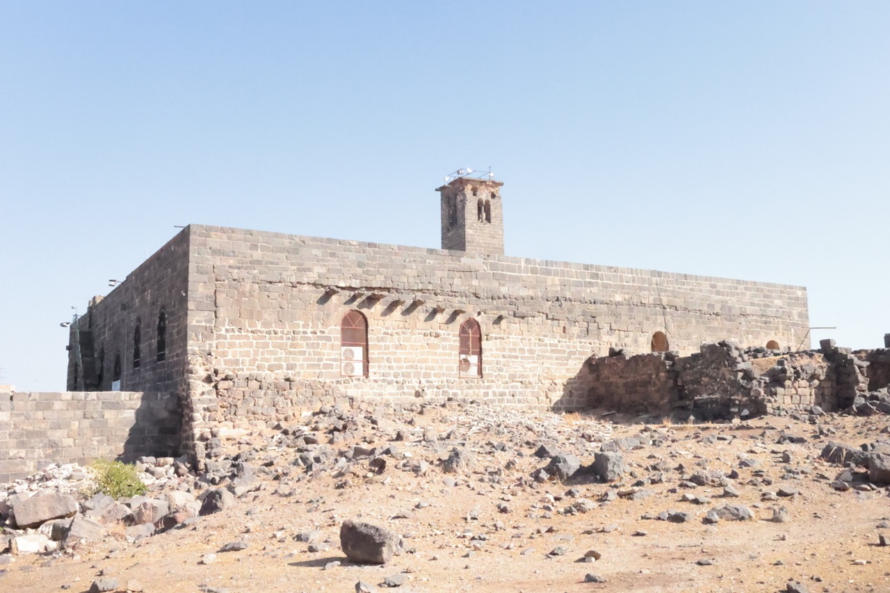 В 513 году, согласно исчезнувшей надписи, был построен храм свв. Сергия, Вакха и Леонтия. Культ первых двух святых пришел в Босру из северосирийской Ресафы, возможно, вместе с планом колонного тетраконха. Однако в Босре он был переосмыслен: четырехлепестковая колоннада с Г-образными столпами была вписана в круг, который, в свою очередь, был помещен внутрь квадрата, из-за чего стены храма оказались прорезаны внутри и снаружи многочисленными апсидами и полукруглыми нишами. Сложную форму имеет и восточная часть храма: по сторонам вимы с выраженной снаружи апсидой расположены проходные помещения (закрывавшиеся дверями), к которым примыкают два пастофория с апсидами. Храм был украшен резными деталями из местного базальта. В ходе войны в южную стену церкви попал снаряд. К востоку от храма находятся два сильно перестроенных богатых византийских дома, один из которых, с триконхиальным залом, отождествлялся с епископским дворцом.