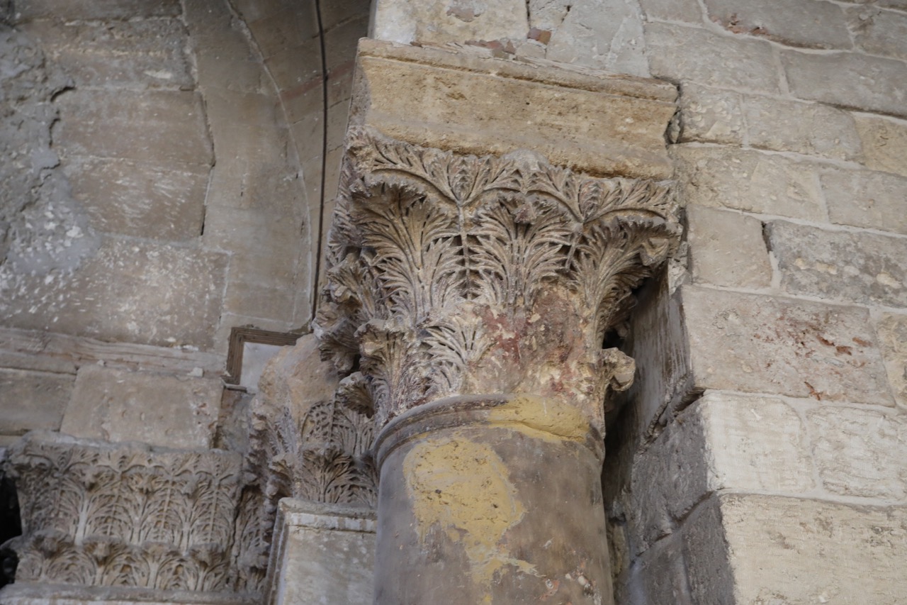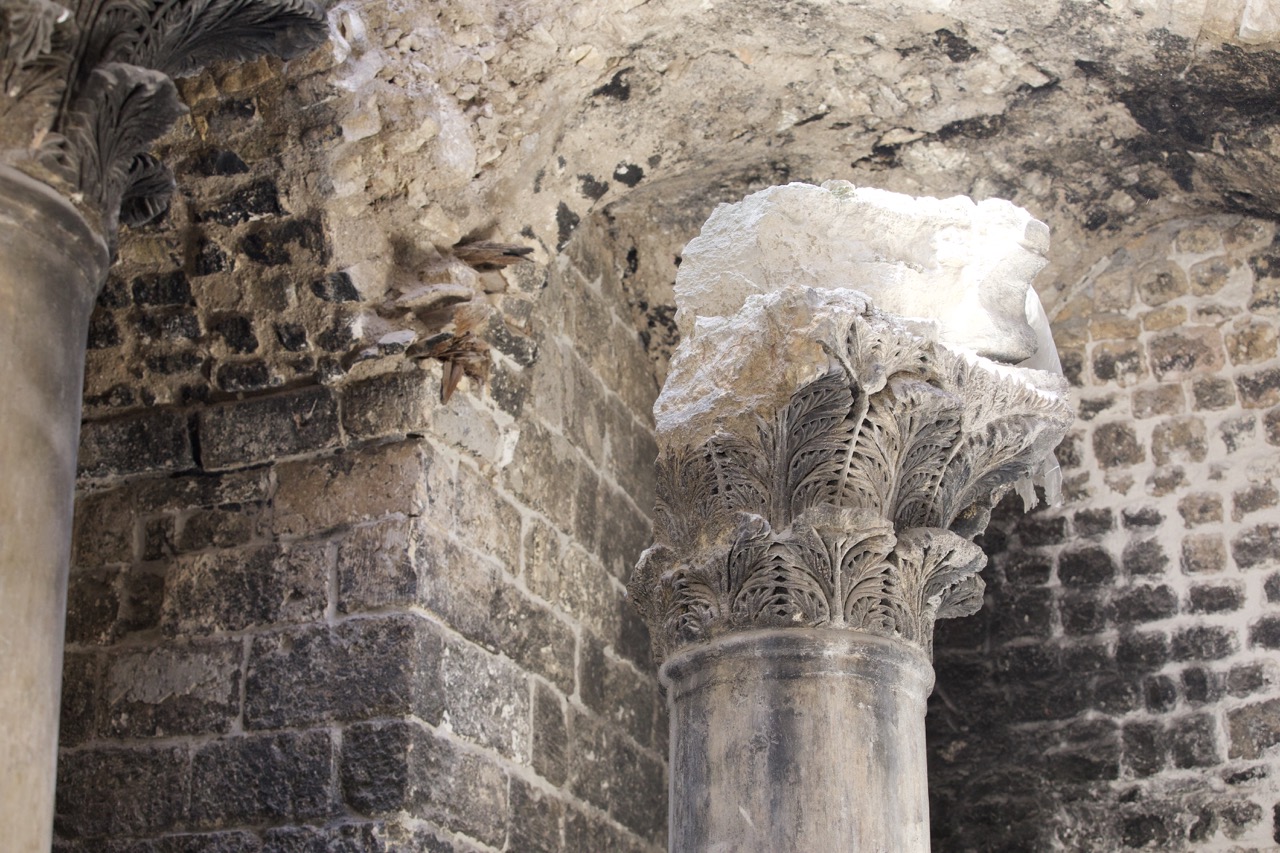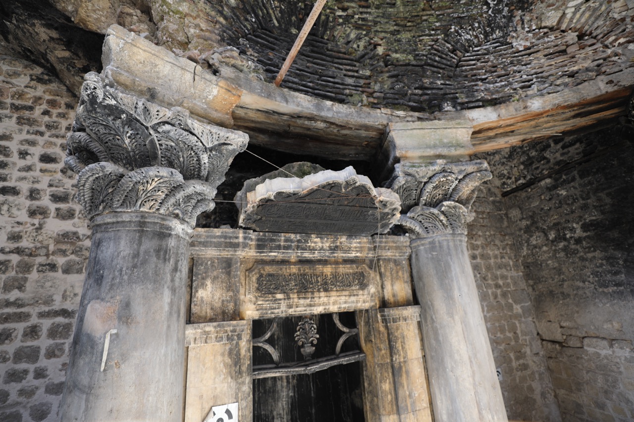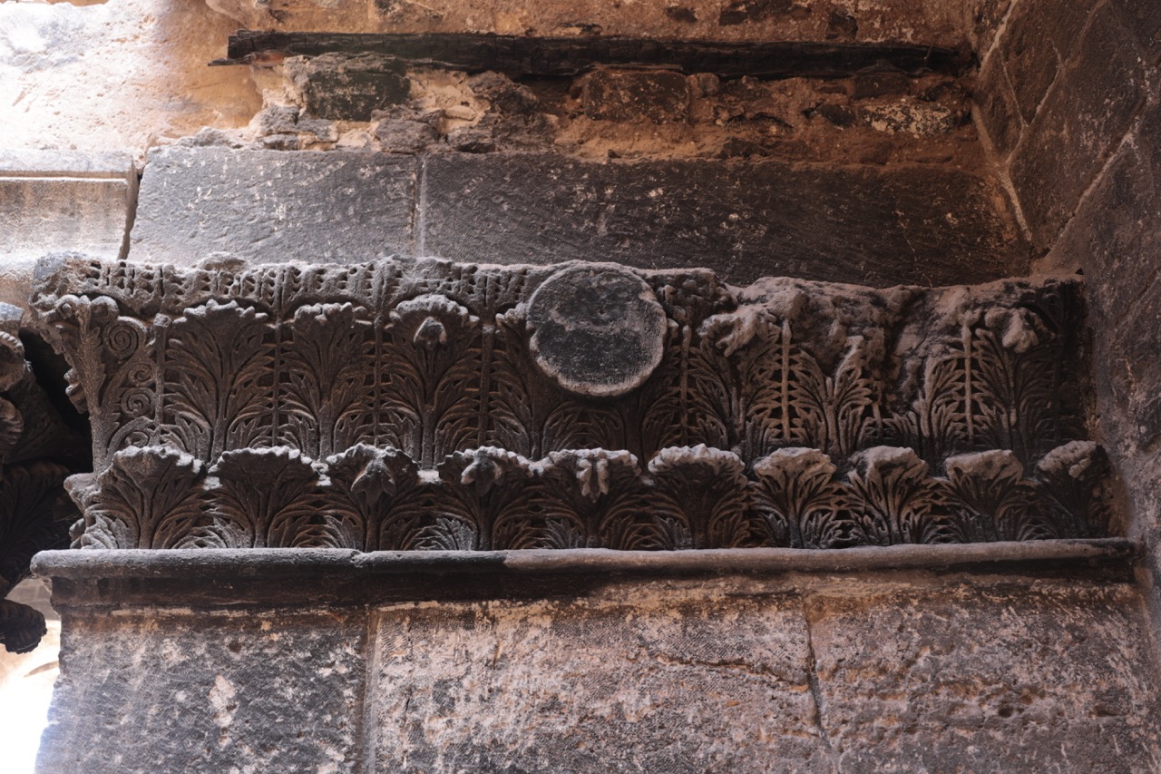 Столпы украшены резными карнизами с листьями аканфа (со стесанными медальонами), а колонны на высоких постаментах — резными коринфскими капителями, причем по центру экседры две капители сделаны в виде завитых ветром листьев аканфа в два ряда, с разным направлением. Во внутренних углах столпов, над карнизом, вставлены небольшие сложно профилированные консоли. На торце стены к северу от северо-восточного столпа помещена необычная капитель в виде чаши. Кроме того, далее к северу, в западный фасад внутреннего двора медресе встроены поддерживающие исламскую арку две византийские колонны с родными пьедесталами и капителями. Еще две византийские колонки с капителью вставлены в помещения второго яруса в северной и восточной части комплекса медресе. У западного портала медресе вторично использована кубическая купель с плоской резьбой (изображения крестов и орнамента) на одной стороне. Грабительские раскопки у северо-восточного столпа показали, что первоначальный уровень пола был значительно ниже и что колонны стоят на типичных для Сирии пьедесталах (как и вторично использованные колонны во дворе). По типу резьбы К. Штрубе датирует византийскую постройку концом V — началом VI в., т.е. временем строительства основных колонных тетраконхов Сирии.