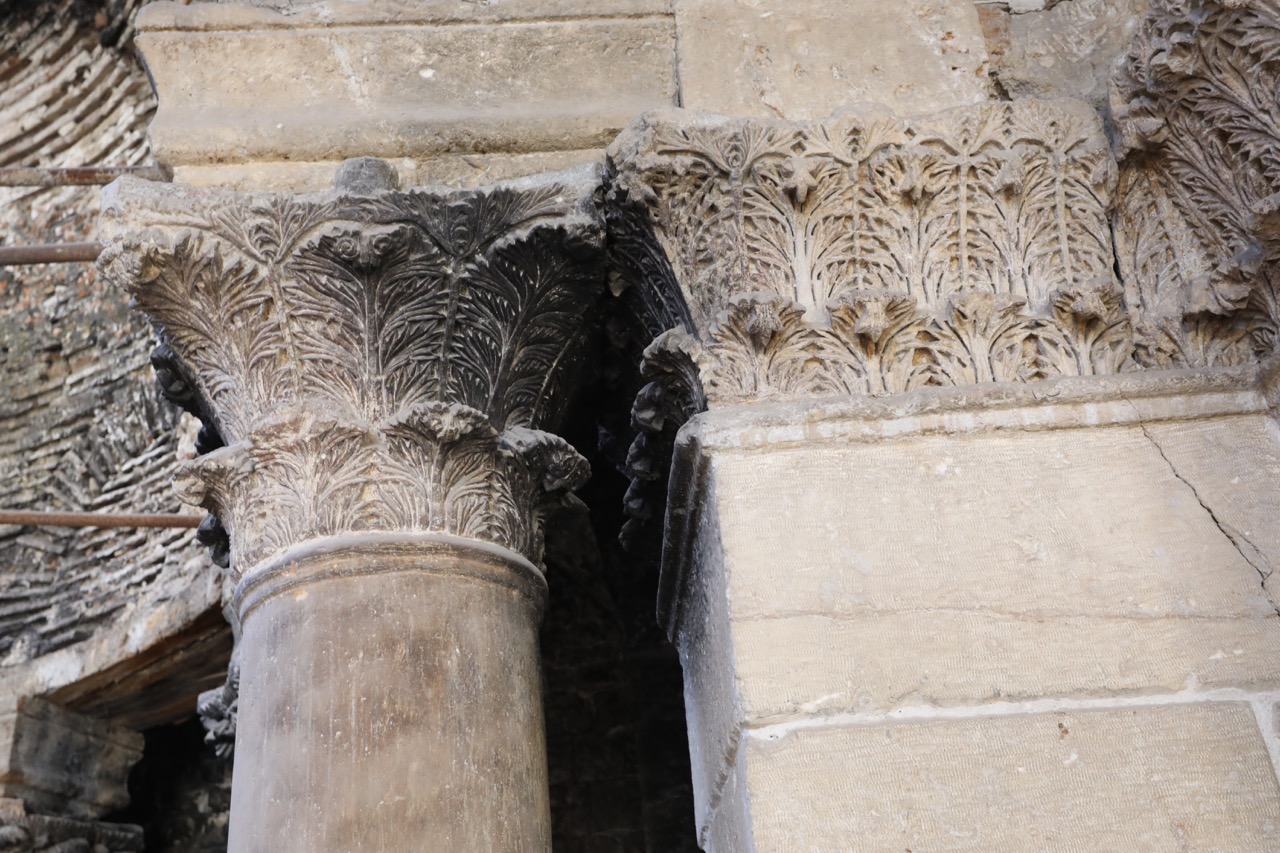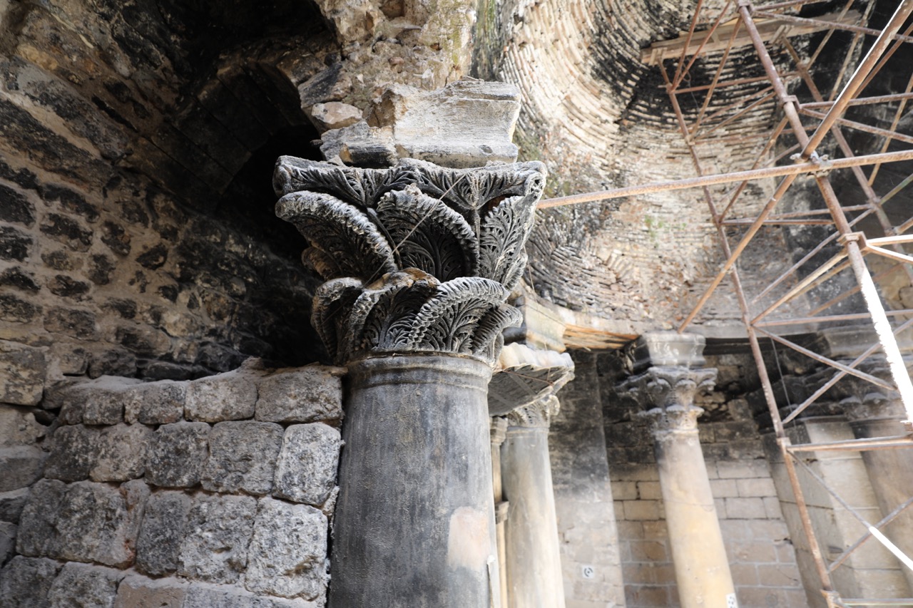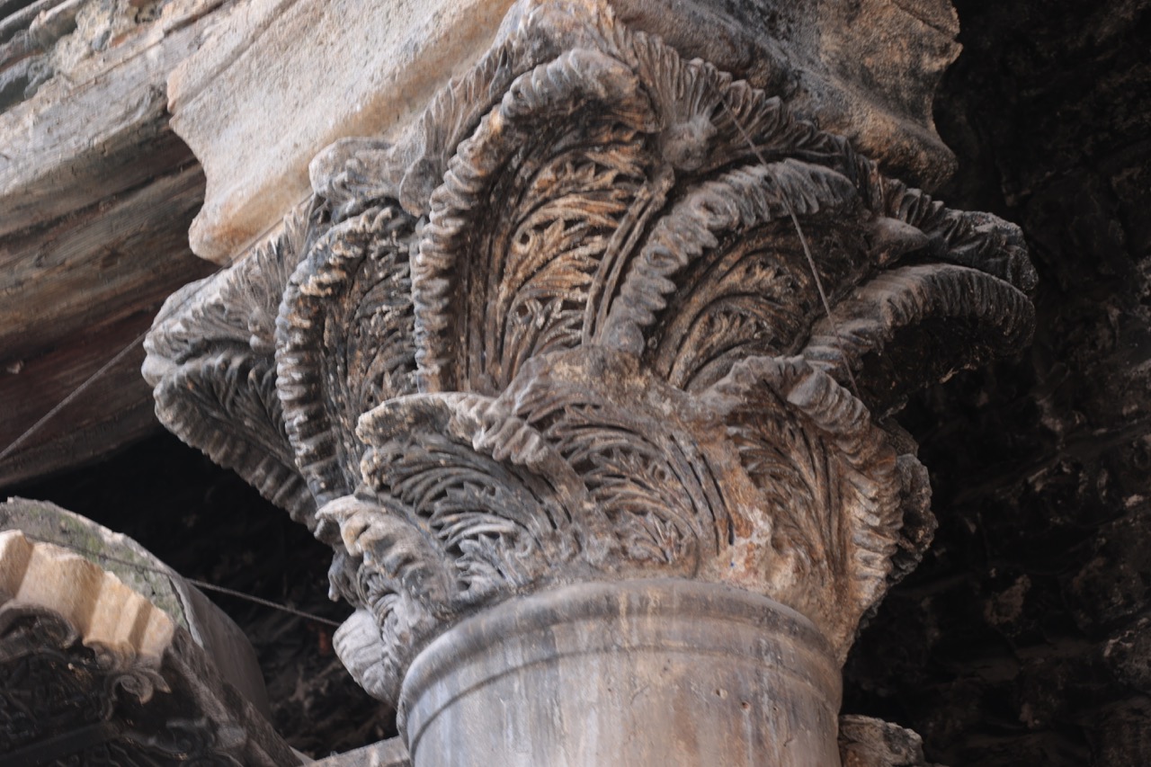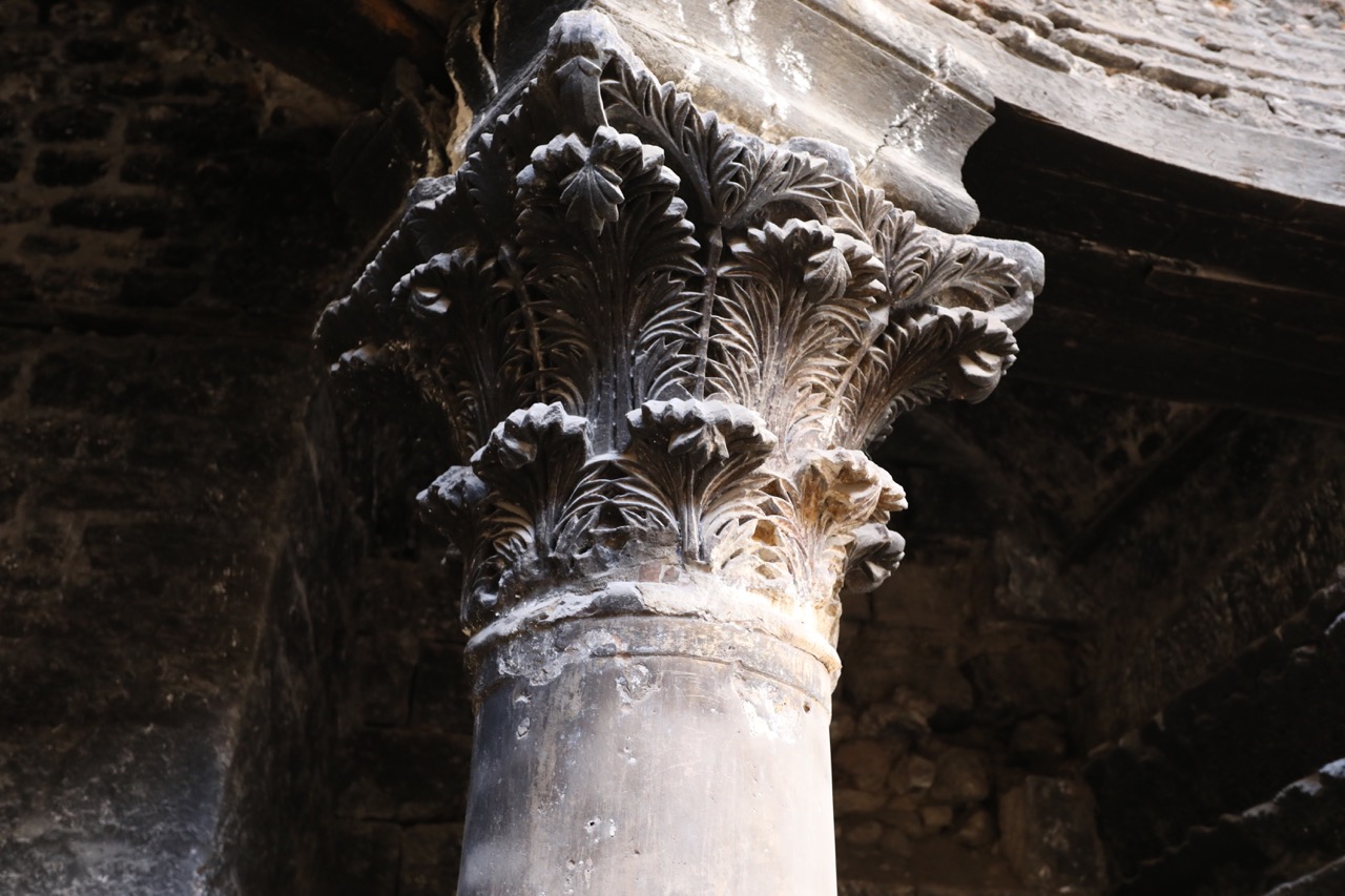 Столпы украшены резными карнизами с листьями аканфа (со стесанными медальонами), а колонны на высоких постаментах — резными коринфскими капителями, причем по центру экседры две капители сделаны в виде завитых ветром листьев аканфа в два ряда, с разным направлением. Во внутренних углах столпов, над карнизом, вставлены небольшие сложно профилированные консоли. На торце стены к северу от северо-восточного столпа помещена необычная капитель в виде чаши. Кроме того, далее к северу, в западный фасад внутреннего двора медресе встроены поддерживающие исламскую арку две византийские колонны с родными пьедесталами и капителями. Еще две византийские колонки с капителью вставлены в помещения второго яруса в северной и восточной части комплекса медресе. У западного портала медресе вторично использована кубическая купель с плоской резьбой (изображения крестов и орнамента) на одной стороне. Грабительские раскопки у северо-восточного столпа показали, что первоначальный уровень пола был значительно ниже и что колонны стоят на типичных для Сирии пьедесталах (как и вторично использованные колонны во дворе). По типу резьбы К. Штрубе датирует византийскую постройку концом V — началом VI в., т.е. временем строительства основных колонных тетраконхов Сирии.