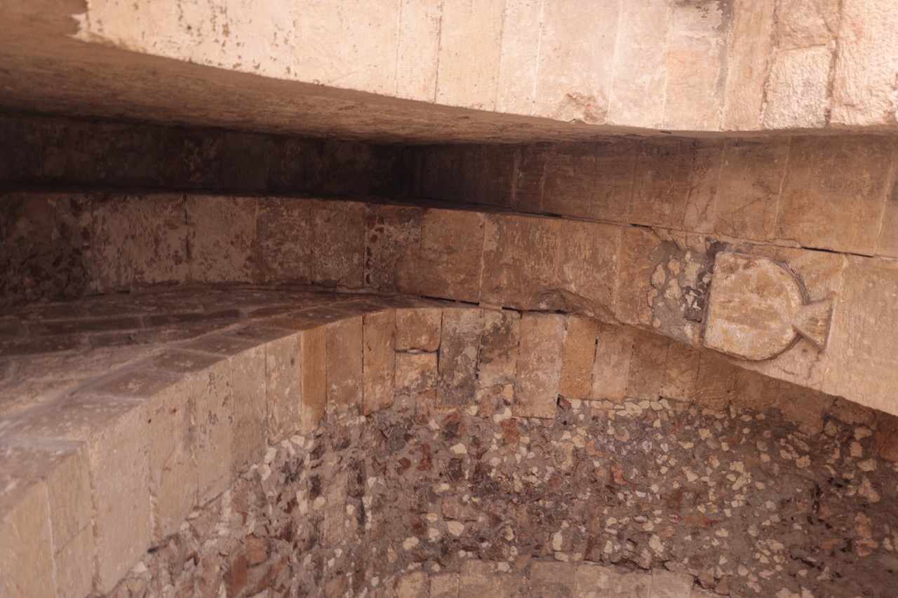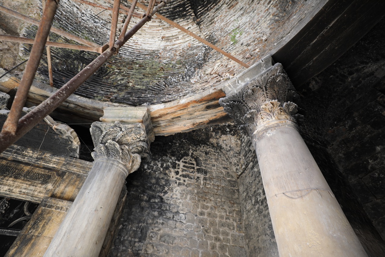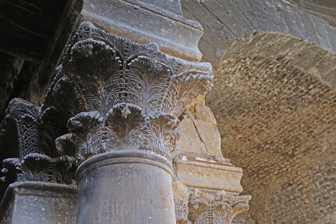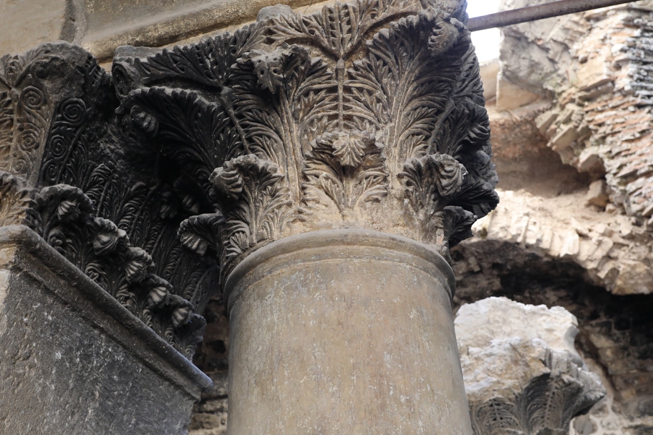 Столпы украшены резными карнизами с листьями аканфа (со стесанными медальонами), а колонны на высоких постаментах — резными коринфскими капителями, причем по центру экседры две капители сделаны в виде завитых ветром листьев аканфа в два ряда, с разным направлением. Во внутренних углах столпов, над карнизом, вставлены небольшие сложно профилированные консоли. На торце стены к северу от северо-восточного столпа помещена необычная капитель в виде чаши. Кроме того, далее к северу, в западный фасад внутреннего двора медресе встроены поддерживающие исламскую арку две византийские колонны с родными пьедесталами и капителями. Еще две византийские колонки с капителью вставлены в помещения второго яруса в северной и восточной части комплекса медресе. У западного портала медресе вторично использована кубическая купель с плоской резьбой (изображения крестов и орнамента) на одной стороне. Грабительские раскопки у северо-восточного столпа показали, что первоначальный уровень пола был значительно ниже и что колонны стоят на типичных для Сирии пьедесталах (как и вторично использованные колонны во дворе). По типу резьбы К. Штрубе датирует византийскую постройку концом V — началом VI в., т.е. временем строительства основных колонных тетраконхов Сирии.