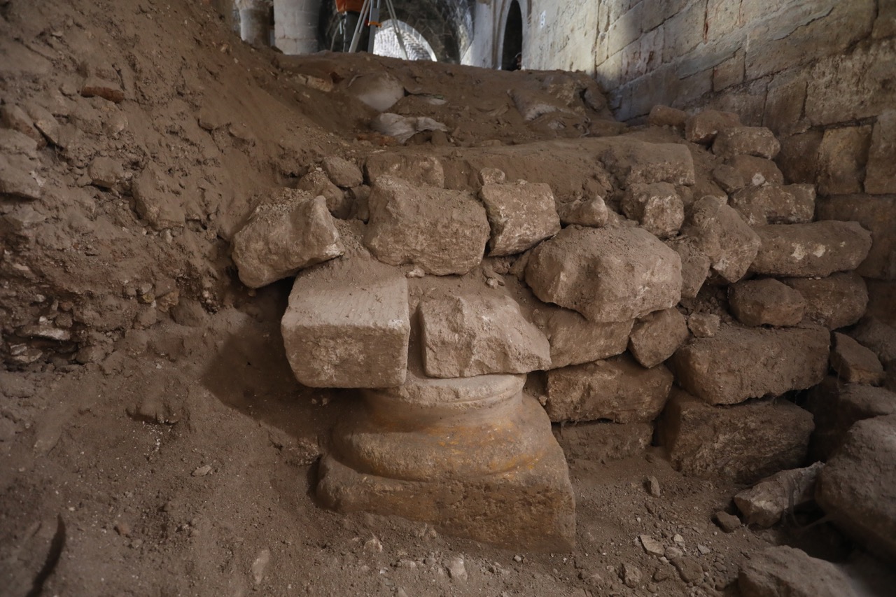 Снятие поздней штукатурки позволило выделить кладки, аналогичные кладке ранневизантийских столпов (из хорошо отесанных крупных квадров): к ним относятся кусок стены к северу от северо-восточного столпа и соединяющая их арка. Грабительские раскопки, произведенные после частичного разрушения медресе Халавия в ходе гражданской войны, обнажили цоколь северо-восточного столпа и основание колонны к югу от юго-западного столпа. Переход от центральных столпов к внешнему абрису стен осуществлялся по-разному: на севере (с востока) через арку, опирающуюся на поперечную стену, а на юге (с запада) через колонну. Однако точная его форма не реконструируется: он мог иметь и форму четырехлистника (как в большинстве колонных тетраконхов), так и более сложный облик (как в Свв. Сергии, Вакхе и Леонтии в Босре, где это ротонда, вписанная в прямоугольник и прорезанная апсидами, или в тетраконхе Ресафы, где западная и восточная часть удлинены, хотя в медресе Халавия это маловероятно). Нельзя исключать здесь и наличия второго яруса, хотя в сирийских колонных тетраконхах он неизвестен. Колонные тетраконхи к западу от основной базилики известны в крупных ранневизантийских церковных комплексах (например, на юстиниановской стадии храма Абу-Мина в Египте): они могли выполнять разные функции, в т.ч. баптистерия (ср. упоминания Ибн-Шаддада об бассейне в Медресе Халавия).