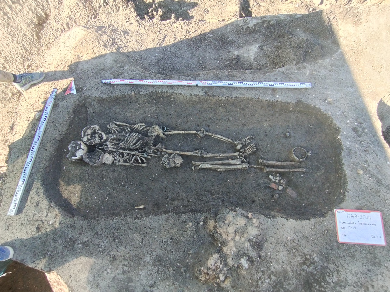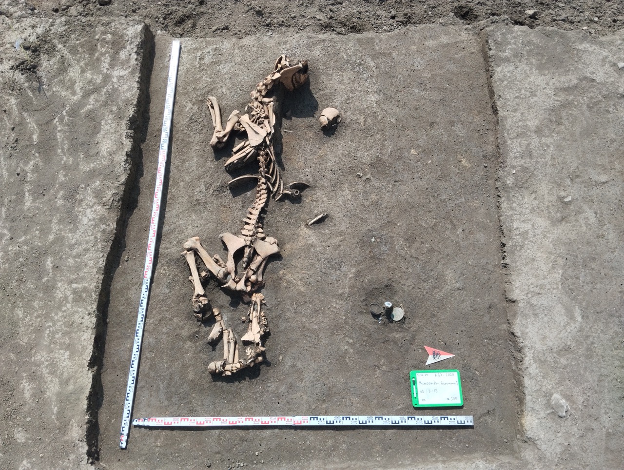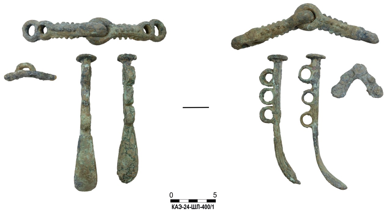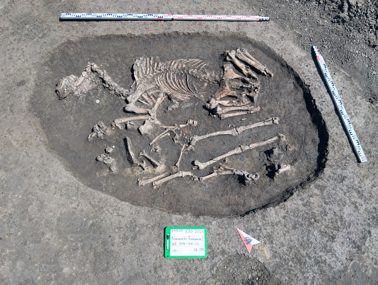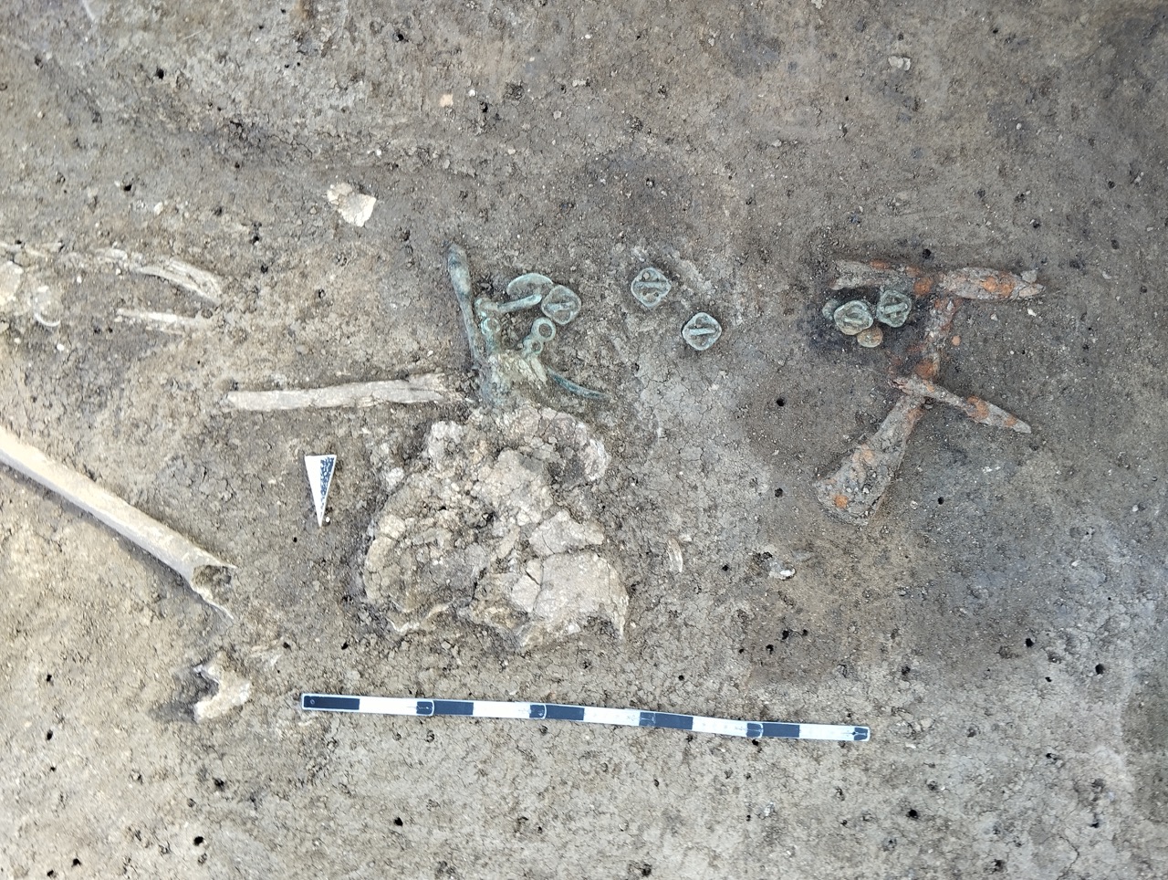 К концу мая 2024 года на участке площадью 3500 кв. м уже обнаружено 150 погребений первых веков н. э., совершенных по обряду ингумации в простых грунтовых ямах, расположенных параллельными рядами по линии северо-запад–юго-восток. Как было установлено, в могильнике захоронены люди разного возраста, пола, достатка и социального положения, среди которых следует особо отметить группу погребений всадников с конями (рис. 2–4). К сожалению, большая часть захоронений были ограблены еще в древности, но даже оставшиеся предметы погребального инвентаря свидетельствуют о высоком уровне благосостояния погребенных. В составе находок представлены железное оружие и доспехи (мечи, копья, шлемы, кольчуги), бронзовые и золотые украшения и фурнитура (зеркала, перстни с геммами, фибулы, застежки, пряжки, пуговицы, нашивные бляшки, пронизки), золотые и пастовые бусы, монеты, керамическая и стеклянная посуда, остатки заупокойной трапезы