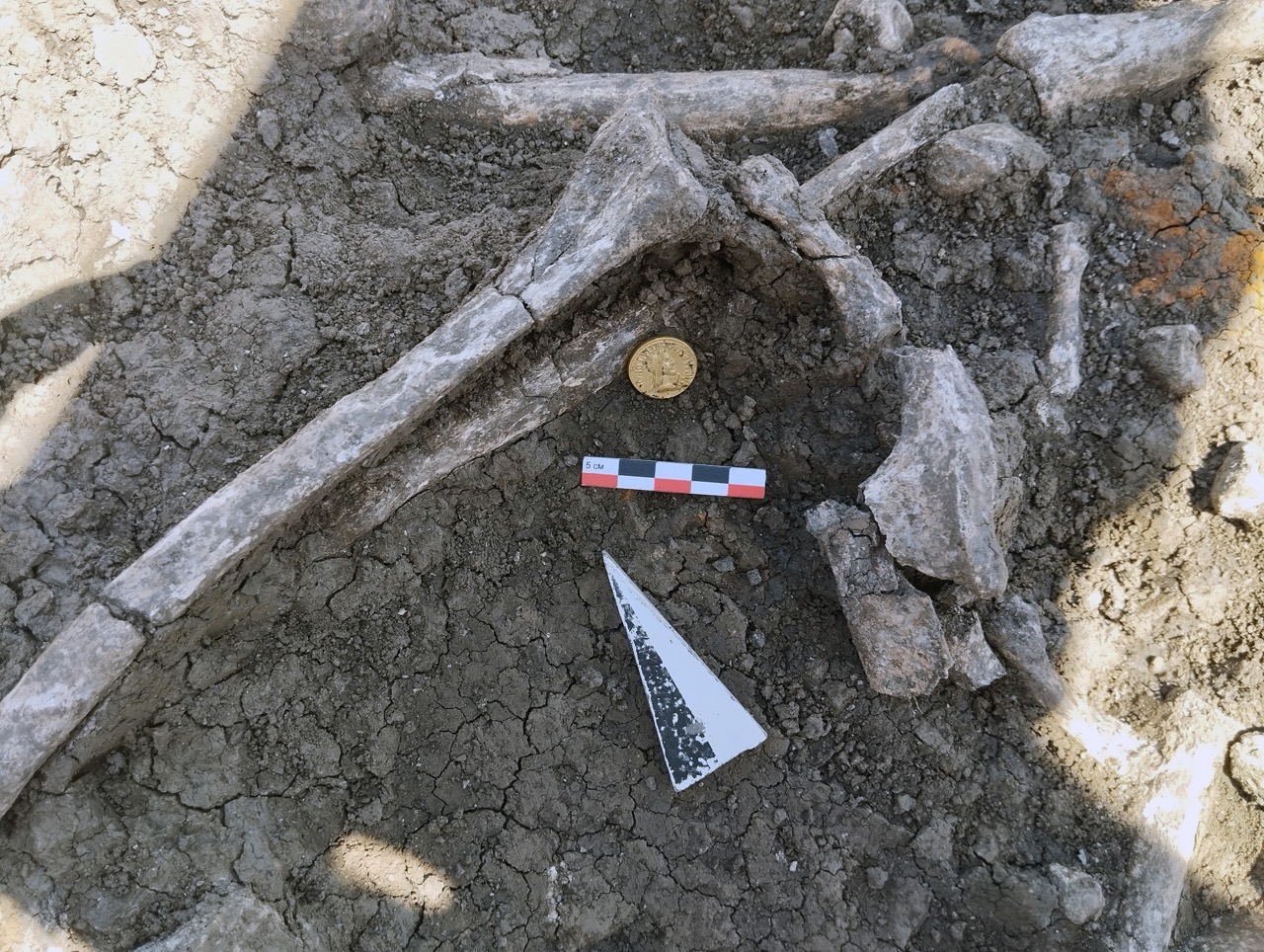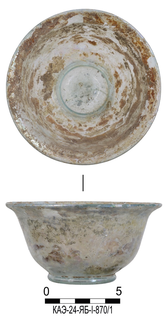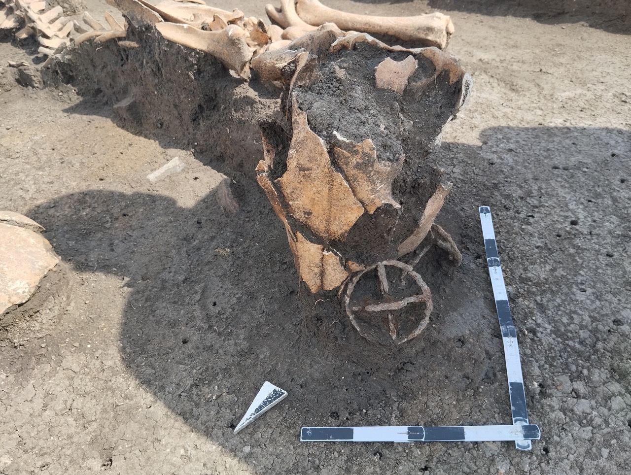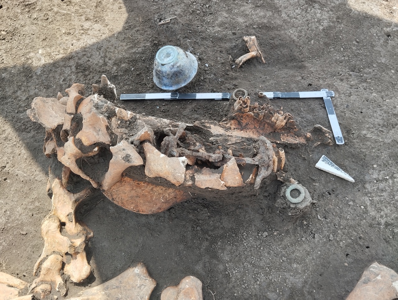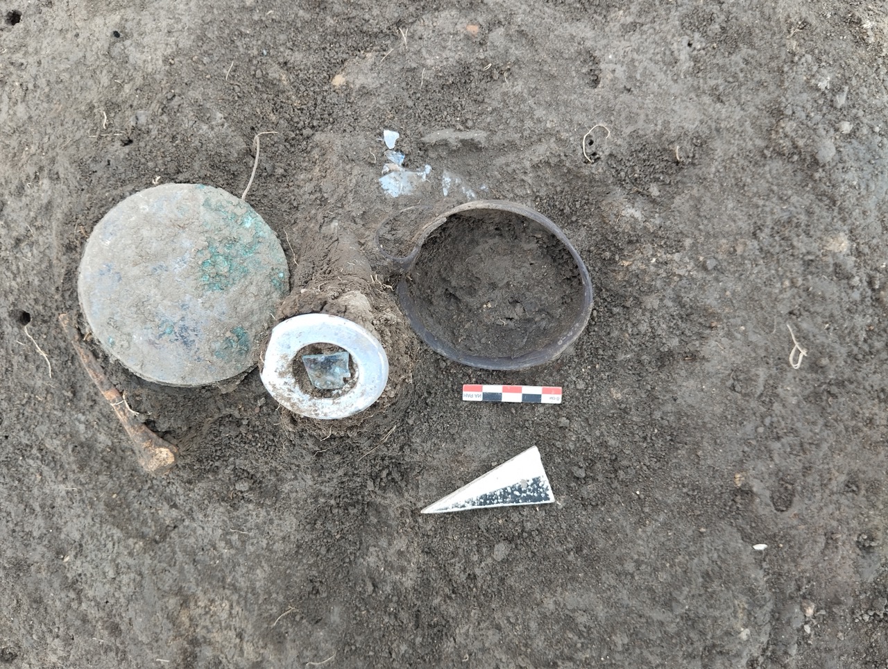 К концу мая 2024 года на участке площадью 3500 кв. м уже обнаружено 150 погребений первых веков н. э., совершенных по обряду ингумации в простых грунтовых ямах, расположенных параллельными рядами по линии северо-запад–юго-восток. Как было установлено, в могильнике захоронены люди разного возраста, пола, достатка и социального положения, среди которых следует особо отметить группу погребений всадников с конями (рис. 2–4). К сожалению, большая часть захоронений были ограблены еще в древности, но даже оставшиеся предметы погребального инвентаря свидетельствуют о высоком уровне благосостояния погребенных. В составе находок представлены железное оружие и доспехи (мечи, копья, шлемы, кольчуги), бронзовые и золотые украшения и фурнитура (зеркала, перстни с геммами, фибулы, застежки, пряжки, пуговицы, нашивные бляшки, пронизки), золотые и пастовые бусы, монеты, керамическая и стеклянная посуда, остатки заупокойной трапезы
