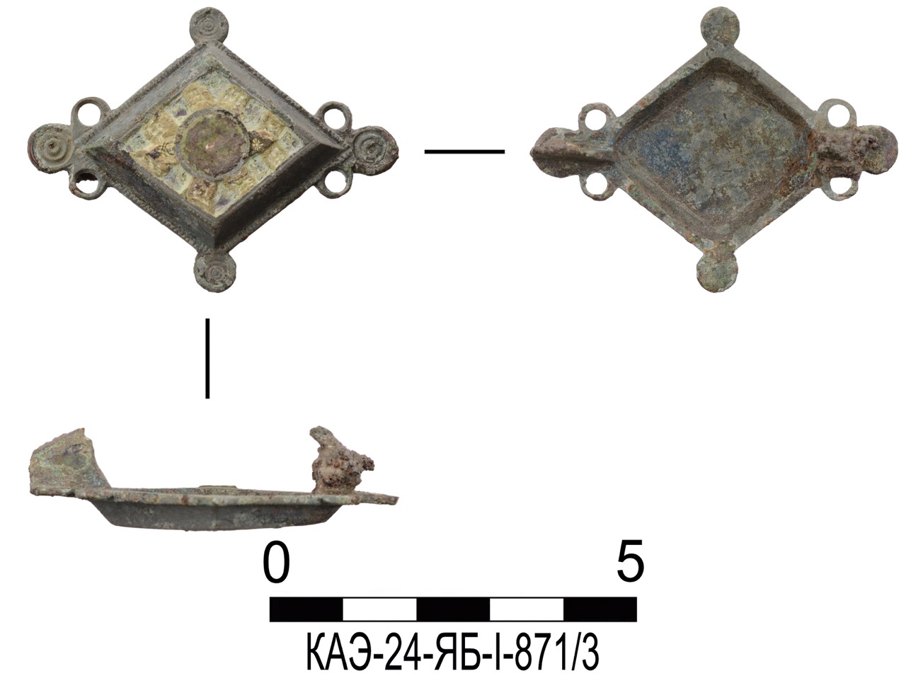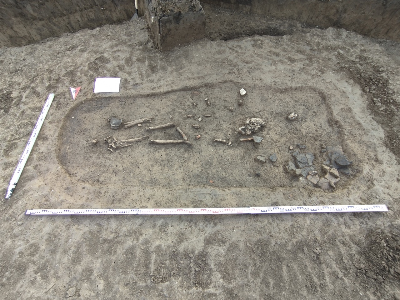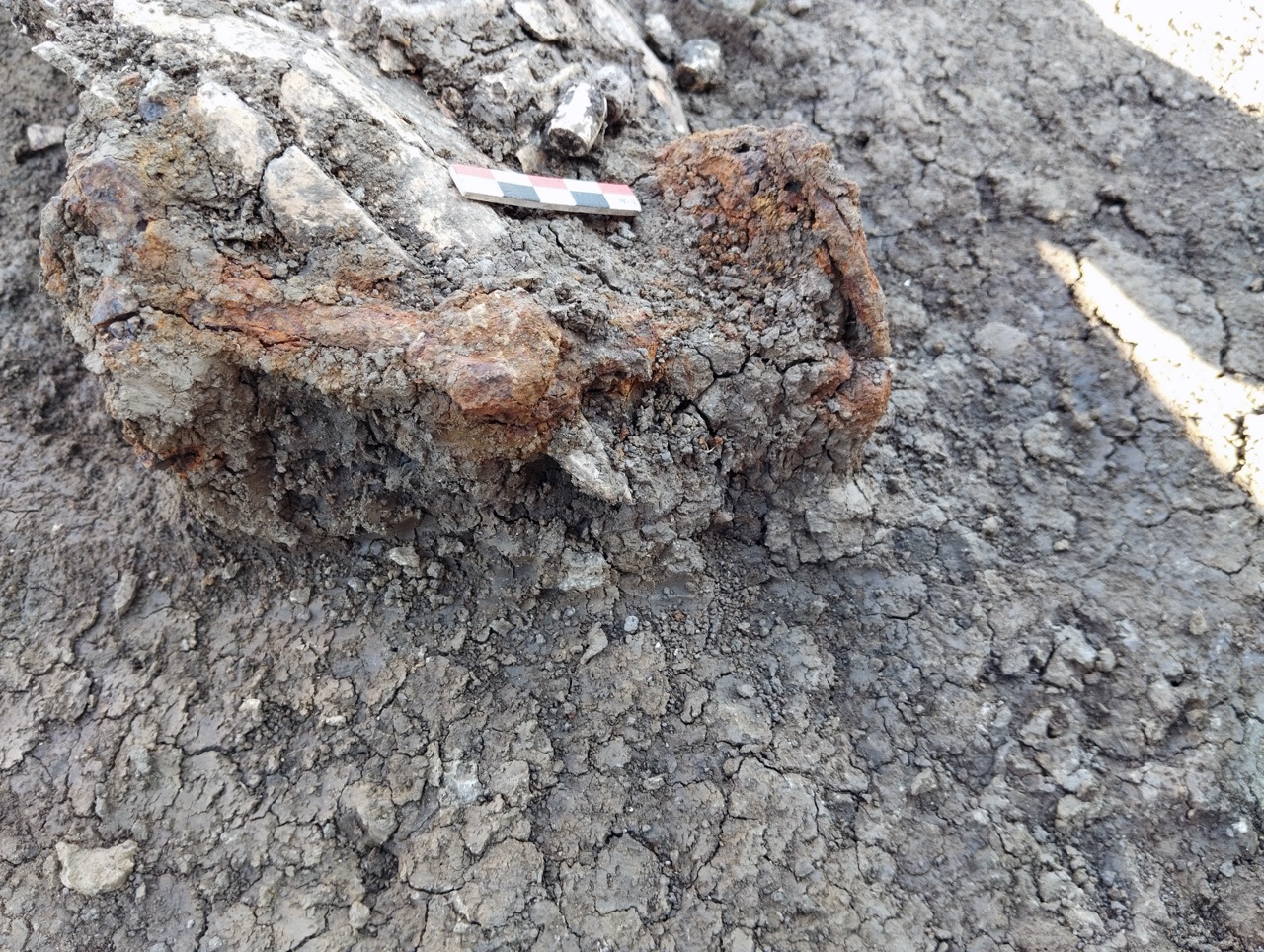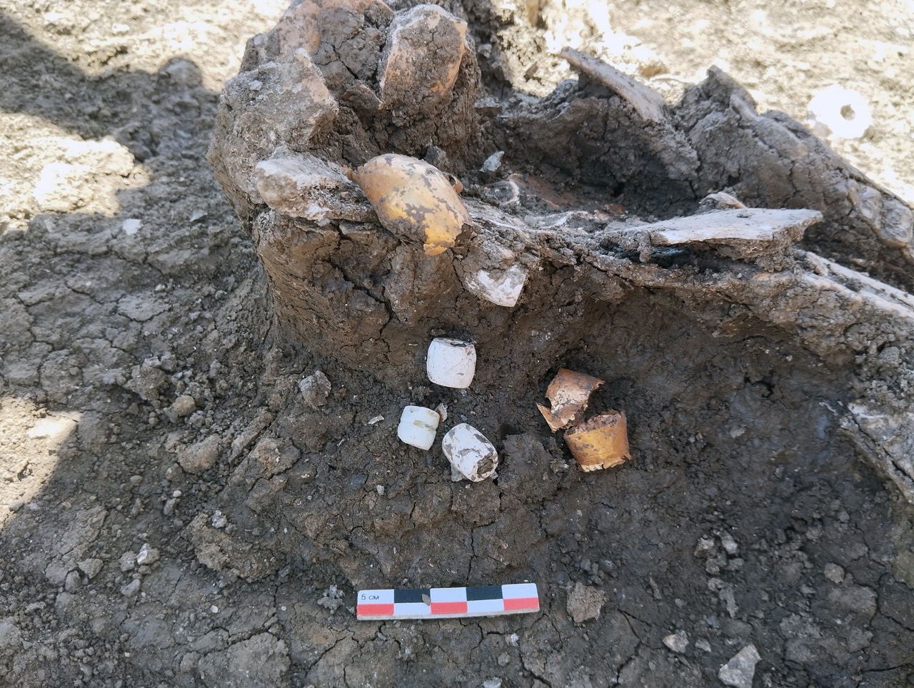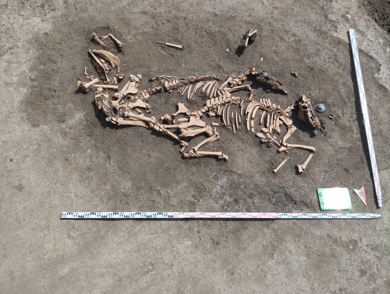 К концу мая 2024 года на участке площадью 3500 кв. м уже обнаружено 150 погребений первых веков н. э., совершенных по обряду ингумации в простых грунтовых ямах, расположенных параллельными рядами по линии северо-запад–юго-восток. Как было установлено, в могильнике захоронены люди разного возраста, пола, достатка и социального положения, среди которых следует особо отметить группу погребений всадников с конями (рис. 2–4). К сожалению, большая часть захоронений были ограблены еще в древности, но даже оставшиеся предметы погребального инвентаря свидетельствуют о высоком уровне благосостояния погребенных. В составе находок представлены железное оружие и доспехи (мечи, копья, шлемы, кольчуги), бронзовые и золотые украшения и фурнитура (зеркала, перстни с геммами, фибулы, застежки, пряжки, пуговицы, нашивные бляшки, пронизки), золотые и пастовые бусы, монеты, керамическая и стеклянная посуда, остатки заупокойной трапезы