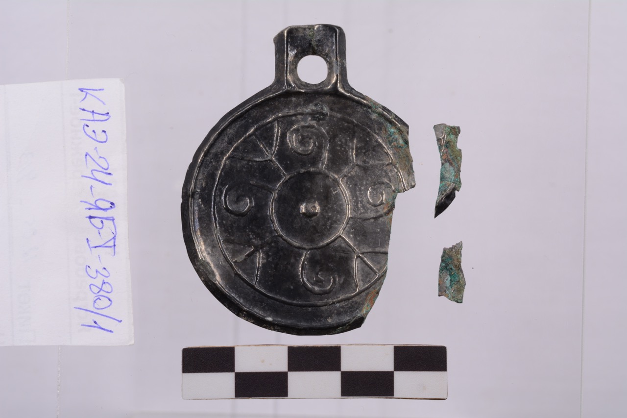 В одном из погребений возле морды лошади найдены железные удила с колесовидными псалиями. Предположительно в ногах погребенного остались незамеченными грабителями серебряный кубок, бронзовая фибула, украшенная перегородчатой эмалью, и бронзовое зеркало с позолотой. На крышке зеркала помещена многофигурная композиция, представляющая Венеру в окружении Амуров. Обнаженная богиня изображена опирающейся на невысокую колонку, к которой прислонен щит; в вытянутой руке она держит шлем. Такой тип изображения принято называть Venus Victrix (Венера Победительница). Он стал особенно популярен в эпоху Римской империи. Именно такая вооруженная Венера украшала личную печать Юлия Цезаря, будучи гарантом его военных побед и одновременно объяснением преемственности власти рода Юлиев. Впоследствии образ часто копировался не только в глиптике, но и в других видах прикладного искусства, а также и в монументальной живописи.