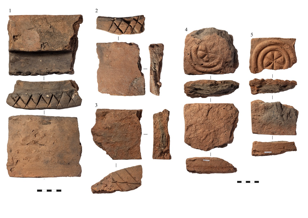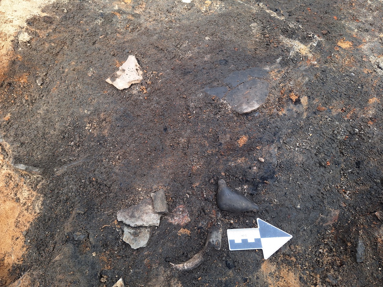 В нижних горизонтах в центральной части территории исследований выявлен сильно поврежденный, фрагментарно сохранившийся слой неолитического селища. Находки каменных орудий представлены многочисленными отщепами и пластинами, фрагментами керамики. Среди неолитических находок отдельно выделяются развалы лепных сосудов с ямочно-гребенчатой орнаментацией и массивный кремневый наконечник. Предварительно, данный неолитический материал был датирован нами 5-4 тысячелетием до нашей эры.