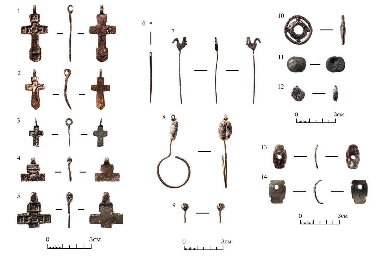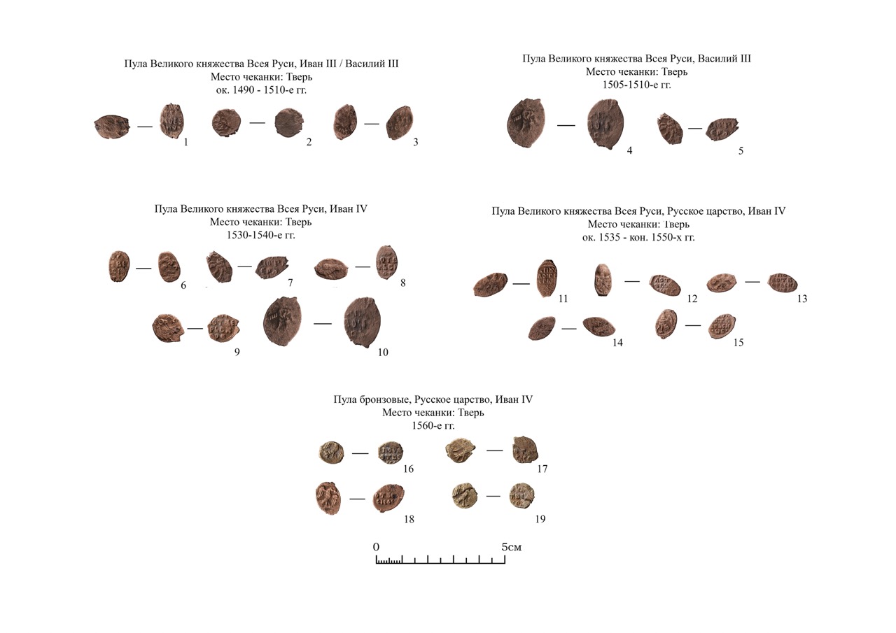 Обнаруженный нумизматический материал представлен находками более 70 монет. Наиболее ранние экземпляры датируются первой половиной 15 века, чеканены в Микулине, Твери и Городене. Большой пласт нумизматических находок составляет коллекция монет 15-16 веков, изготовленных в Твери, Пскове и Москве. В небольшом количестве обнаружены монетные находки 18-20 веков. Среди прочих находок стоит отметить 2 медных креста и иконку, датируемые 13 веком.